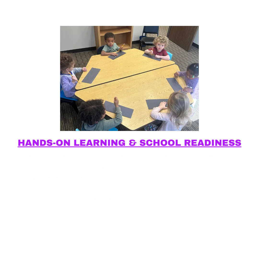 We serve Pre-Kindergarten (ages 3–5) and a state-accredited Kindergarten program focused on early literacy, social skills, and school-readiness.