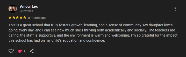 Faith is woven into the school culture through prayer, character building, and seasonal activities (e.g., Christmas caroling). We teach academics with love, respect, and Christ-like values.